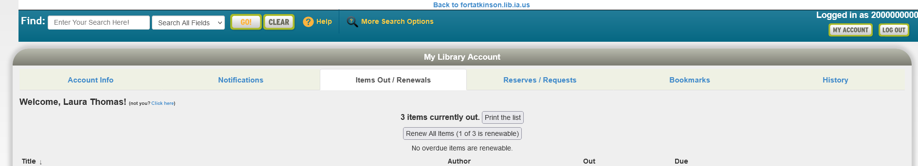 5. Click the renew button to the right of the item. If you have an interlibrary loan item out, that cannot be renewed online. Please call the library 563-534-2222 to renew. The Renew button will be replaced with 'Successfully renewed' and the due date will change when successful.
